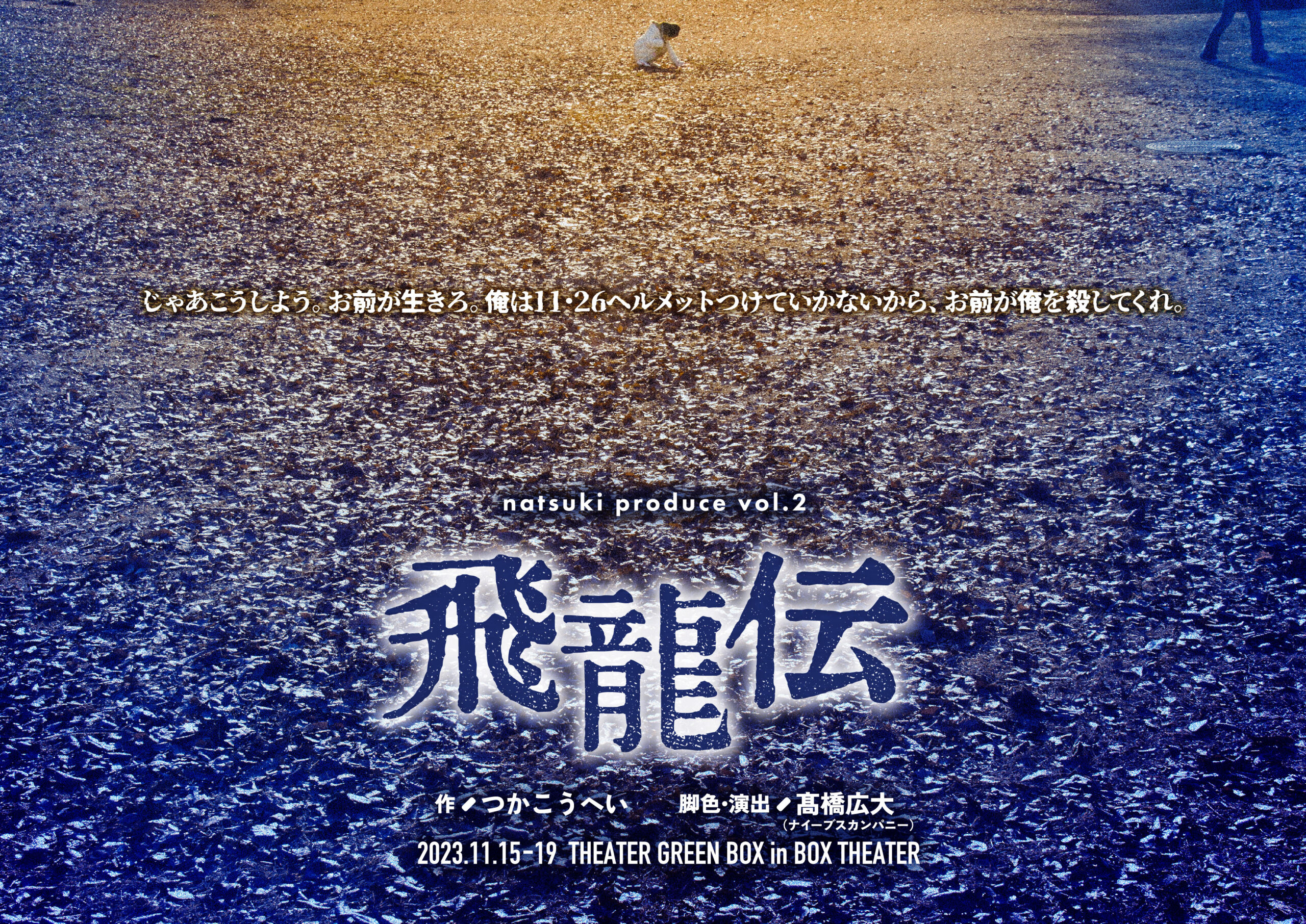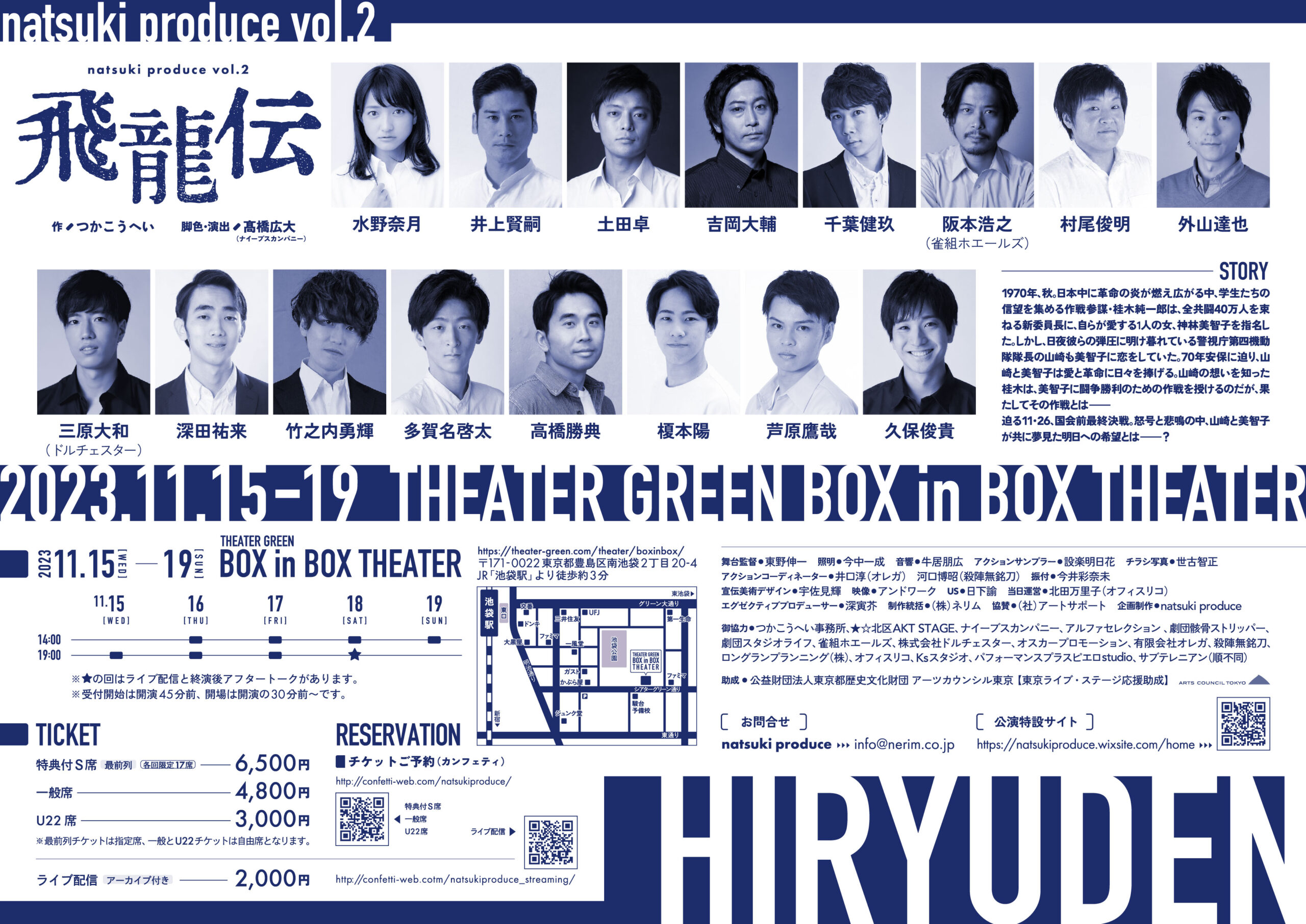 staff ■ 舞台監督:東野伸一/昭明:今中一成/音響:牛居朋広/アクションサンプラー:設楽明日花/チラシ写真:世古智正/アクションコーディネーター:北口淳(オレガ)、河口博昭(殺陣無銘刀)/振付:今井彩奈未/宣伝美術デザイン:宇佐見輝/映像:アンドワーク/US:日下論/当日運営:北田万里子(オフィスリコ)/エグゼクティブプロデューサー:深寅芥/制作統括:(株)ネリム/協賛:(社)アートサポート/企画制作:natsuki procuce/御協力:つかこうへい事務所、★☆北区AKT STAGE、ナイーブスカンパニー、アルファセレクション、劇団骸骨ストリッパー、劇団スタジオライフ、雀組ホエールズ、株式会社ドルチェスター、オスカープロモーション、有限会社オレガ、殺陣無銘刀、ロングランプランニング(株)、オフィスリコ、K'sスタジオ、パフォーマンスプラスピエロstudio、サブテレニアン(順不同)/助成:公益財団法人東京都歴史文化財団 アーツカウンシル東京【東京ライブ・ステージ応援助成】