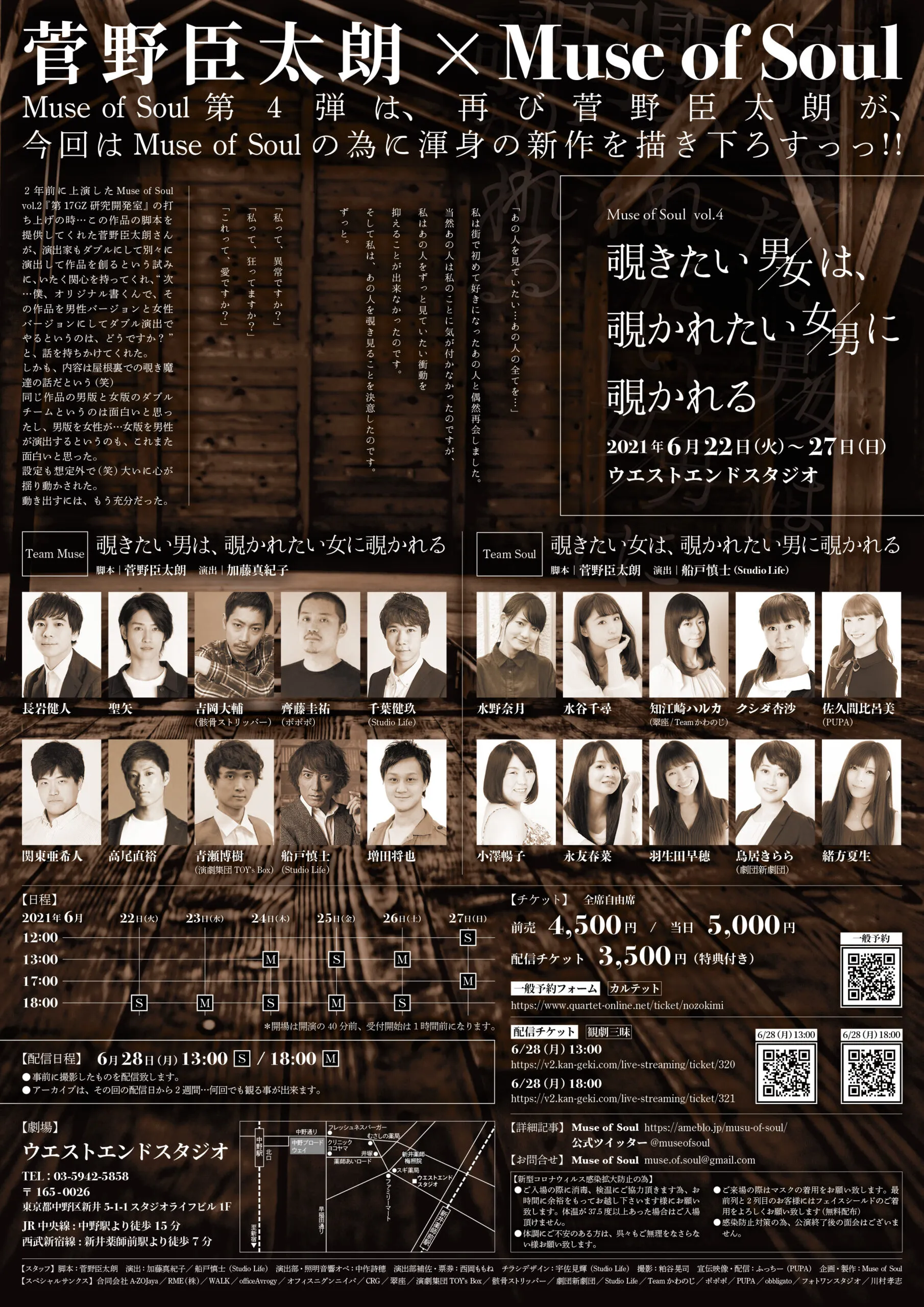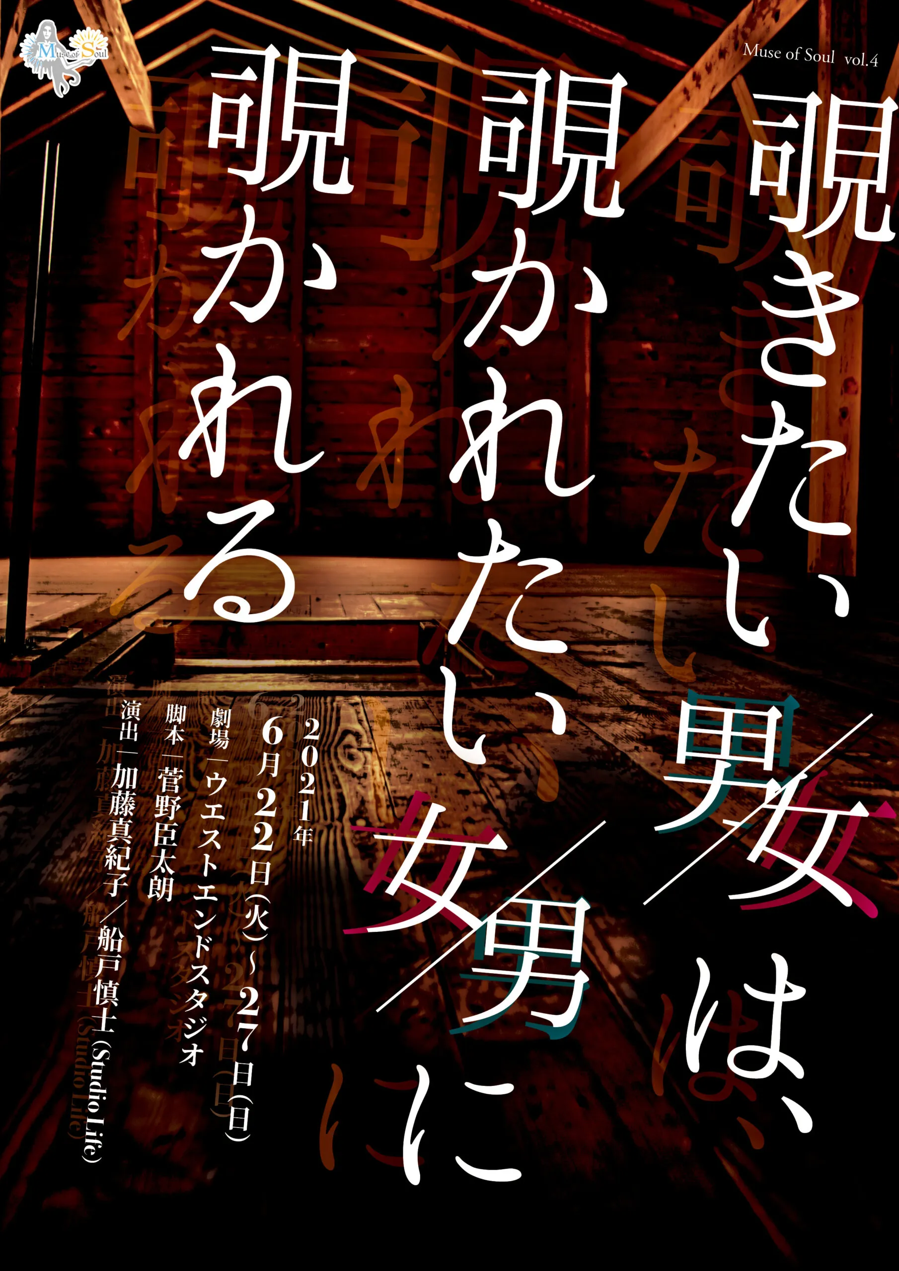 staff ■脚本:菅野臣太朗/演出:加藤真紀子、船戸慎士(Studio Life)/演習部・照明音響オペ:中作詩穂/演出部補佐・票券:西岡ももね/チラシデザイン:宇佐見輝(Studio Life)/撮影:粕谷晃司/宣伝映像・配信:ふっちー(PUPA)/企画・製作:Muse of Soul/スペシャルサンクス:合同会社A-ZOJaya、RME(株)、WALK、officeAvrogy、オフィスニグンニイバ、CRG、翠座、演劇集団TOY's BOX、骸骨ストリッパー、劇団新劇団、Studio Life、Teamかわのじ、ポポポ、PUPA、obbligato、フォトワンスタジオ、川村孝志