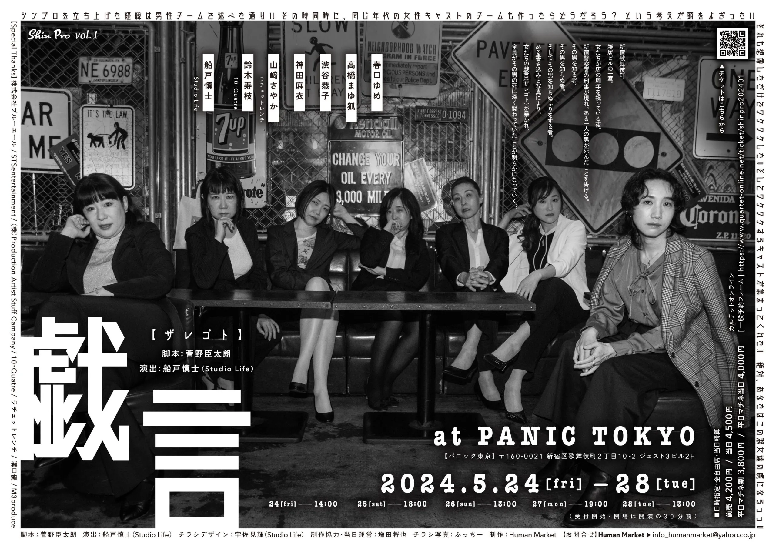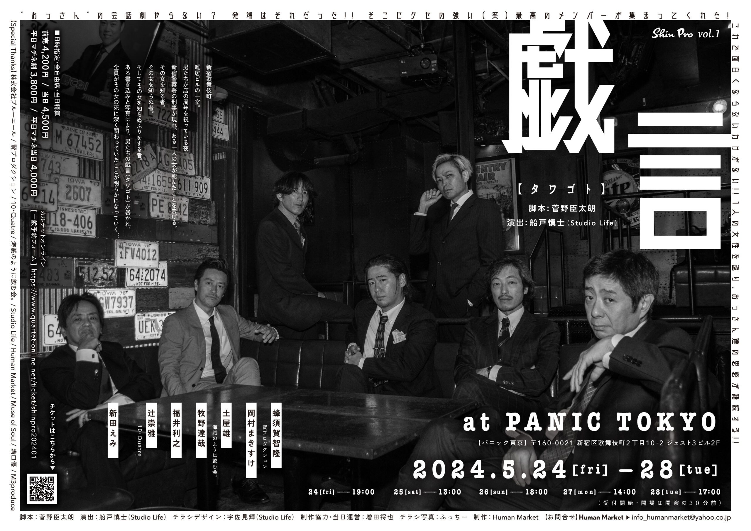 staff ■ 脚本:菅野臣太朗/演出:船戸慎士(Studio Life)/チラシデザイン:宇佐見輝(Studio Life)/制作協力・当日運営:増田将也/チラシ写真:ふっちー/制作:Human Market/Special Thanks:株式会社ブルーエール/賢プロダクション/10・Quatre/海賊のように飲む会。/Studio Life/Human Market/Muse of Soul/溝口優/M3produce